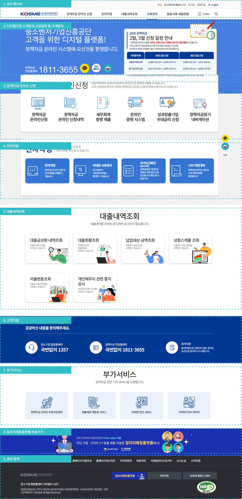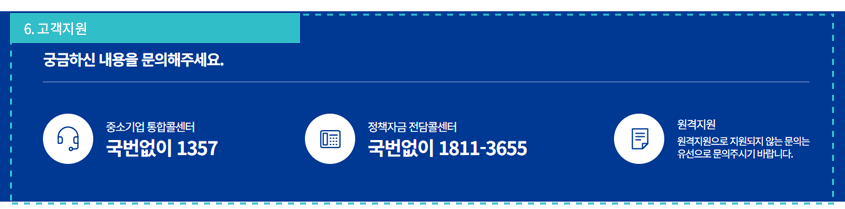 : 정책자금 관련 궁금한 내용을 문의할 수 있도록 다양한 콘텐츠(중소기업 통합콜센터(1357),정책자금 전담콜센터(1811-3655),원격지원)로 지원