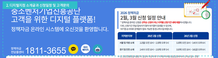 : 디지털지점 소개글과 정책자금 신청일정, 전담콜센터 연락처 및 카카오톡 상담, 마이페이지, 챗봇상담으로 구성