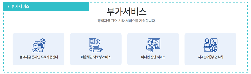 : 정책자금 관련 기타 서비스를 지원합니다.(정책자금 온라인 무료자문센터, 매출채권 팩토링 서비스, 비대면 진단 서비스, 지역본(지)부 연락처)