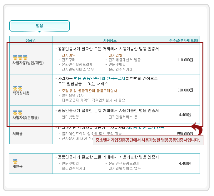 | 개인 공동인증서 | 불가 | 개인용 인증서는 사용 불가 |