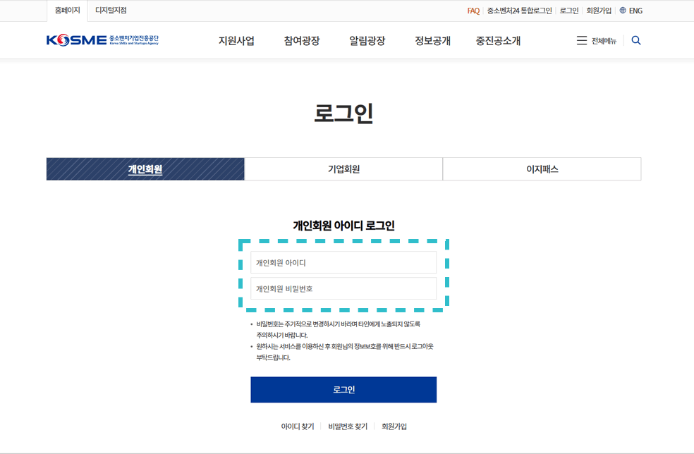 | 로그인 방식 | 홈페이지 회원가입 후 등록한 아이디와 비밀번호 입력 | 개인회원은 공동인증서 로그인을 사용하지 않습니다. |
